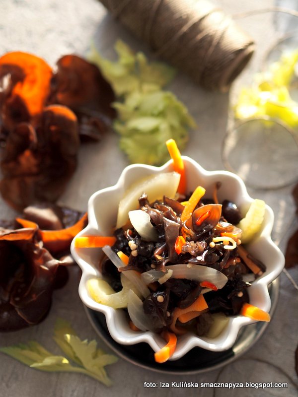 To sałatka z uszaków bzowych. Te grzyby rosną prawie cały rok, jednak najczęściej zbieram je właśnie wczesną wiosną bo sprzyjają im częste deszcze i łatwo je znaleźć kiedy krzewy nie mają jeszcze liści. Grzyby na tę sałatkę zebrałam podczas kulinarnego wyjazdu za miasto. Dodałam do nich trochę warzyw, bardzo aromatyczną zalewę i powstała pyszna, orientalna sałatka.